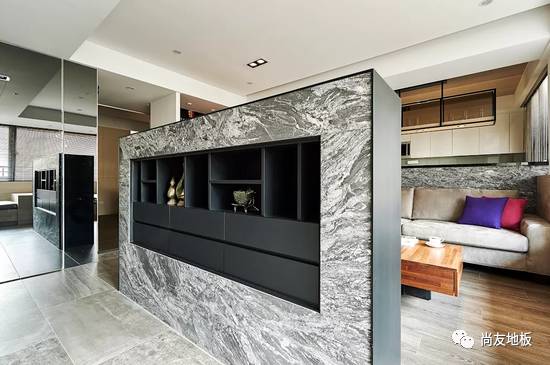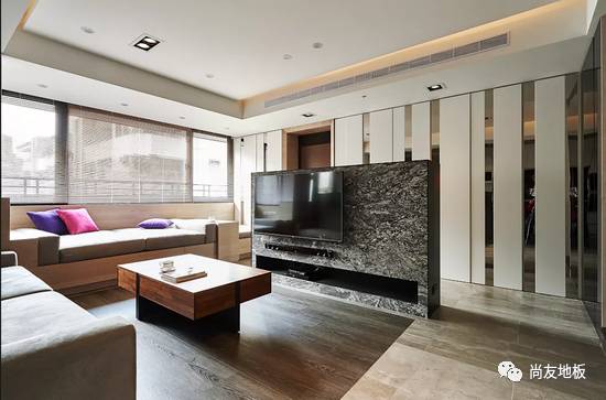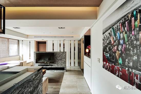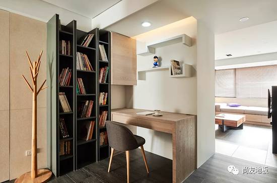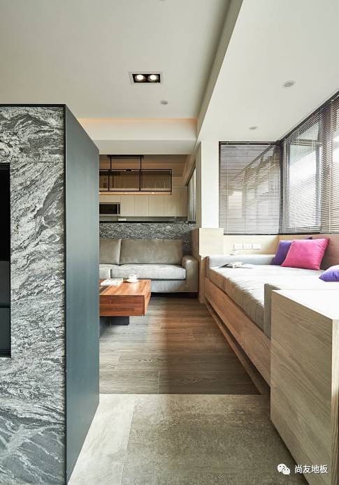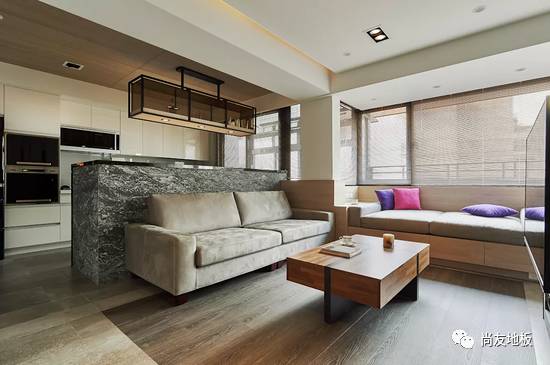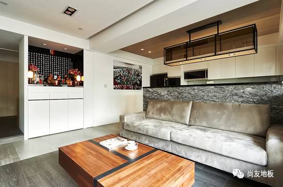 而这个空间在地板上的设计选择了木纹砖与木地板的搭配。除了降低隔间墙来创造空间层次与分野外,公共区的地板选择以木纹砖搭配客厅沙发区的木质地板,运用色差在视觉上可创造出如地毯般的区隔感,同时也顺应屋主太太希望好整理与温馨感的双重要求。